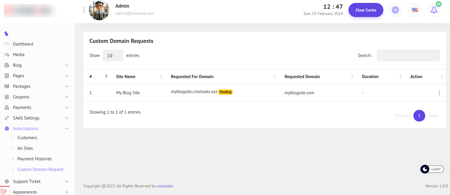 1. Admin can see all the custom domain request lists by clicking "Subscriptions > Custom Domain Request".