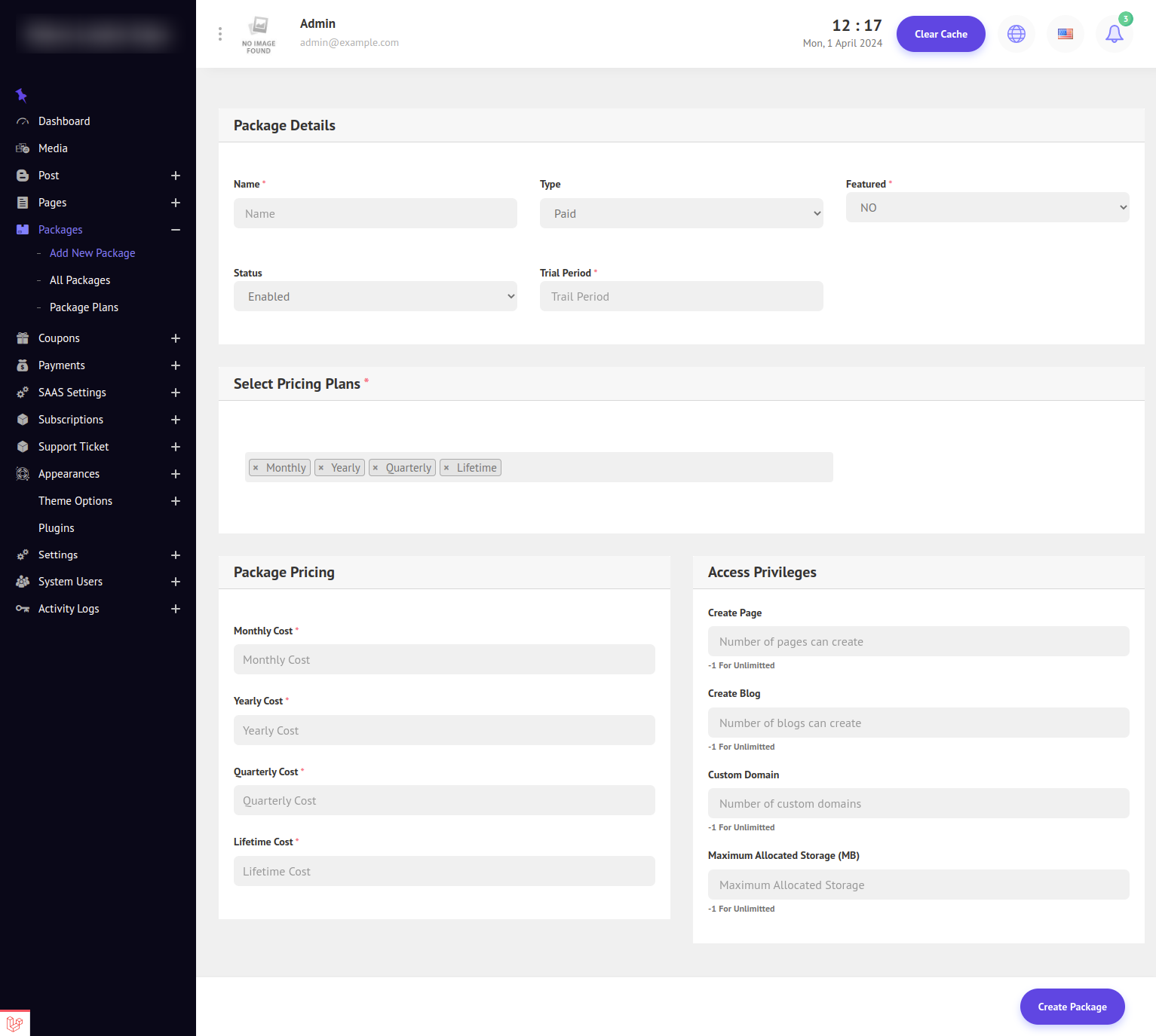 2. In the package adding form fill in all the basic information, select pricing plans, set prices for the plans and access privileges and finally click the "Create Package" button to create a package.