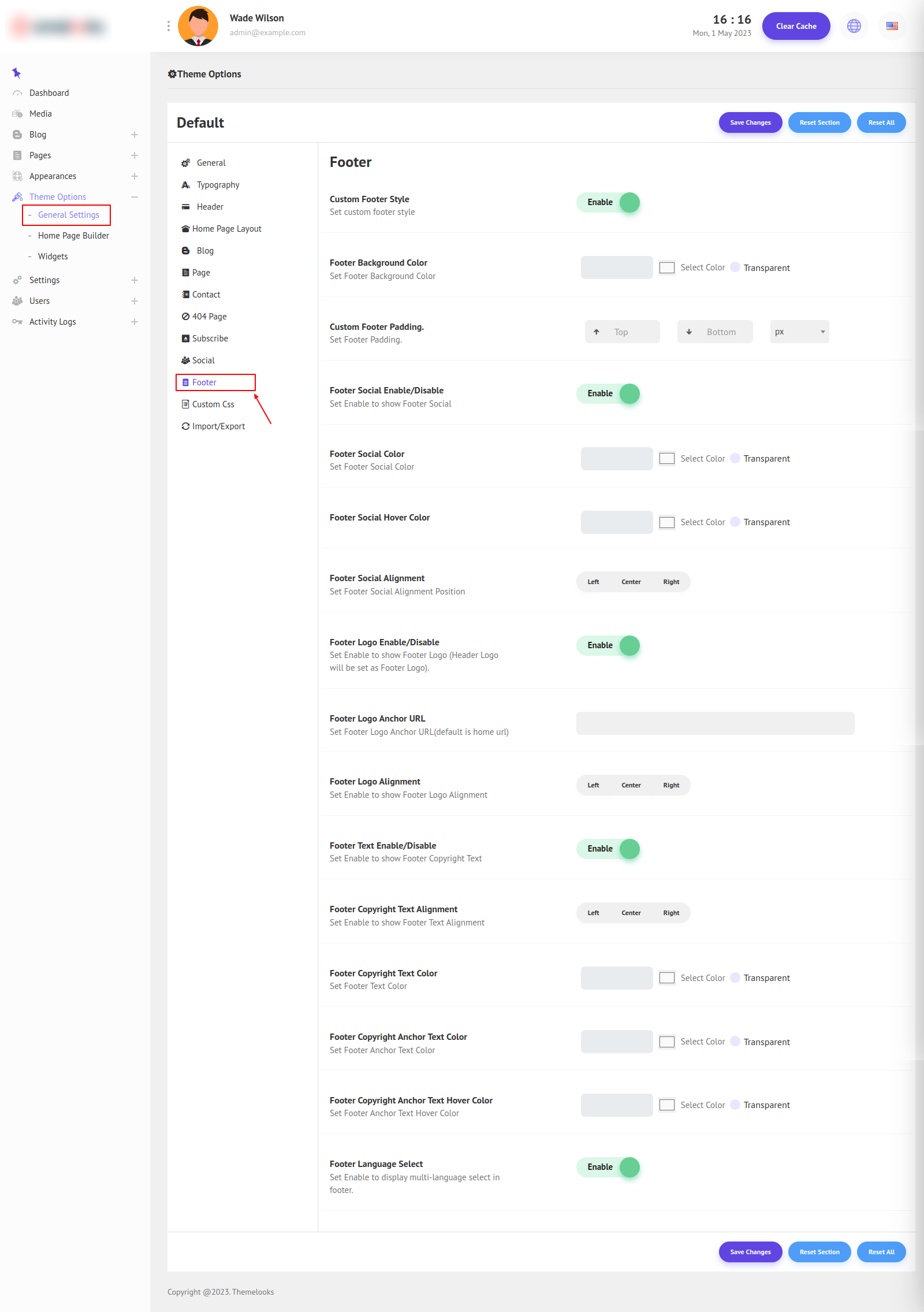 You can customize the Footer Section as you like. Follow Theme Options > General Settings. Here click Footer, and the footer fields will appear.