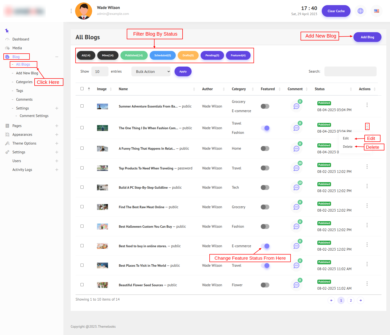 Follow Blogs > All Blogs to see the blog list page. Here you can filter blogs, manage status, edit blogs, delete blogs, and also can create blogs.