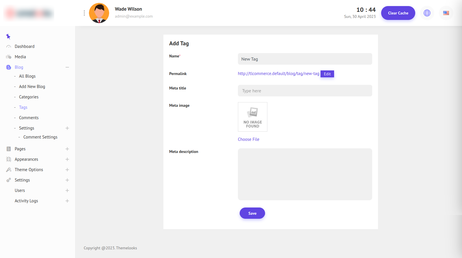 To create a new tag click Add Blog Tag button and you will be redirected to another page. Here you can give a name and edit the permalink and set SEO information.